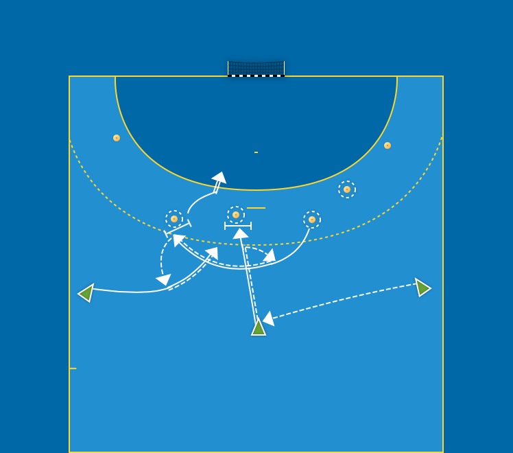 Linjeväxel med nedhåll. H9 spelar M9 som satsar på H3 (nedhåll), M9 växlar upp M6 som går ut i en båge och växlar upp V9. Samtidigt som växeln sker slår M6 en sidspärr på H2. V9 avslutar eller spelar in till M6 som faller ner på linjen. Alternera mellan höger och vänster sida.
