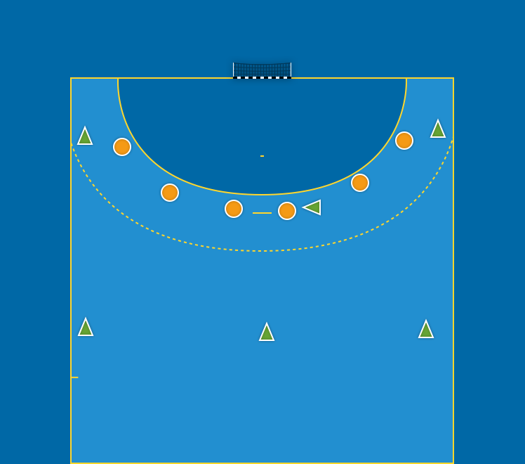 Tillämpningsövning 6 mot 6 (6-0- och 3-2-1-försvar). Testa rullningsspel, växelspel, isärdragningar och K6:ans spel, och integrera M6:ans spel. M9 (eller någon annan) styr upp spelet med olika starter.