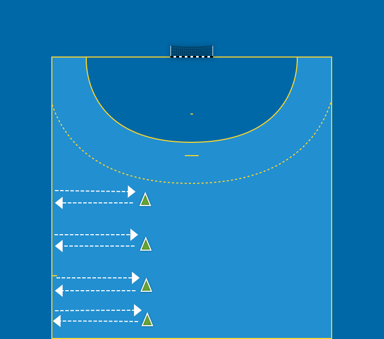 Skott i vägg, sex–åtta meter från väggen. En boll per spelare.För att spelarna på kort tid ska få känna på de olika skottyperna så skjuter man på en fri yta på väggen. Spelaren tar tre steg och skjuter i väggen.