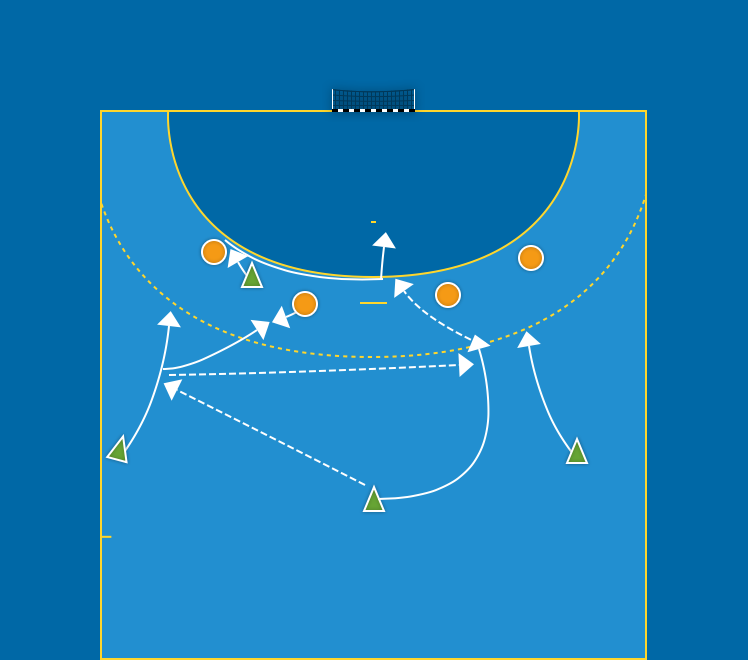 Samma som övning 9. men med M6 rullande. Y9 skjuter om inte 3:an kommer ut. Kommer 3:an ut så spelar Y9 bollen till M9 som söker luckan mellan 3:an och 2:an på andra sidan. M6 kommer rullande bakom den offensiva 3:an och får inspel från M9.