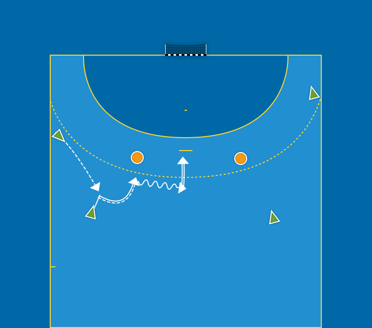 Fyra anfallare, två försvarare, niometersspelarna i rörelse från zon 2 till zon 3.