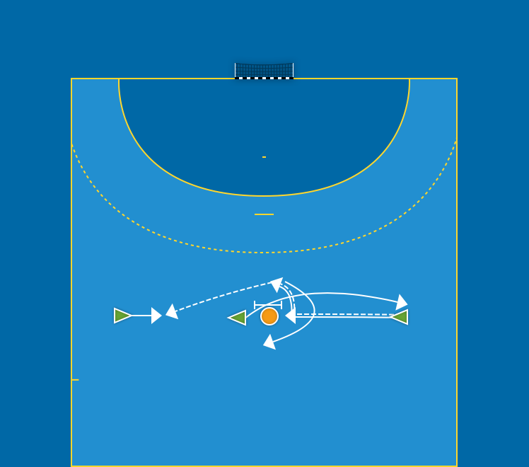 Sidspärr ute på banan i form av ryggspärr och bröstspärr. Fyra spelare och en boll, tre anfallare och en försvarare. Försvararen står mitt på banan, en M6 står bakom försvararen. Anfallarna startar brett (ute i tenniskorridorerna).