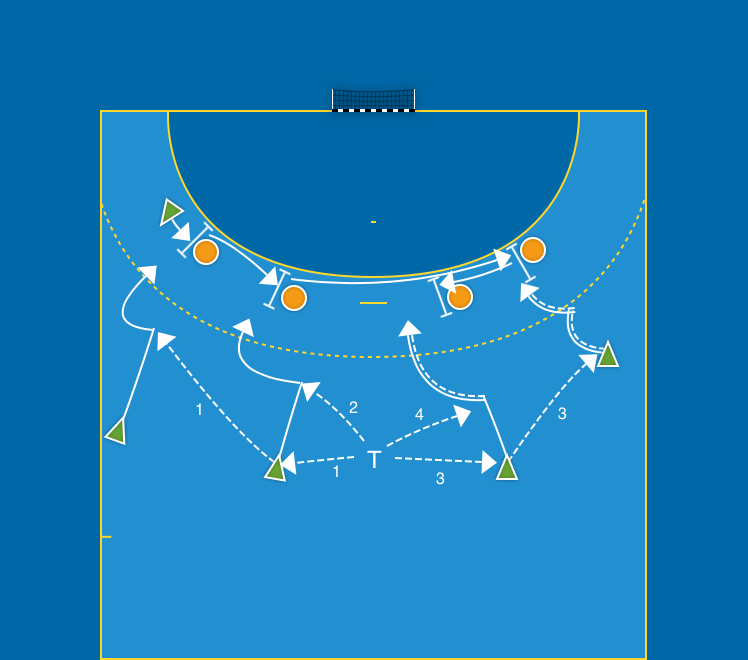 Sidspärr på sex och nio meter i form av ryggspärr och bröstspärr. Sex försvarare eller färre i 6-0-försvarsuppställning. Sju anfallare, varav två M9.