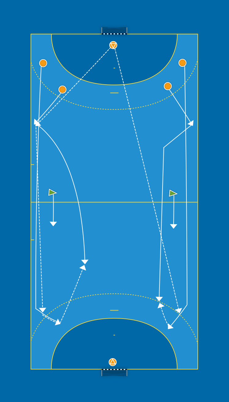 Samma som i övning 4 men med en försvarare mitt på plan. Målvakten väljer fas 1- eller fas 2-kontring. Spelarna kan välja vem som ska avsluta.