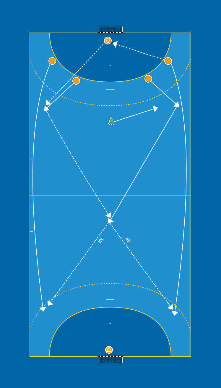 a) Fyra anfallare: V1-V2-H1-H2. Kombination av fas 1 och fas 2. Uppspel via en 2:a, motsatt 2:a skär in i banan och blir spelbar. 2:an tar eget avslut eller spelar vidare till någon av 1:orna (K6:an).
