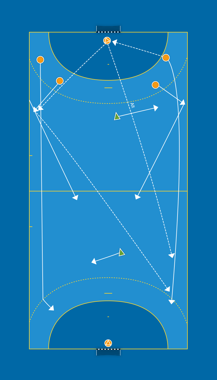 Samma som i övning 6, men med en försvarare på bortre planhalva. Målvakten väljer mellan fas 1- och fas 2-utspel. Fas 2 kommer i 2:a våg och kan få bollen.
