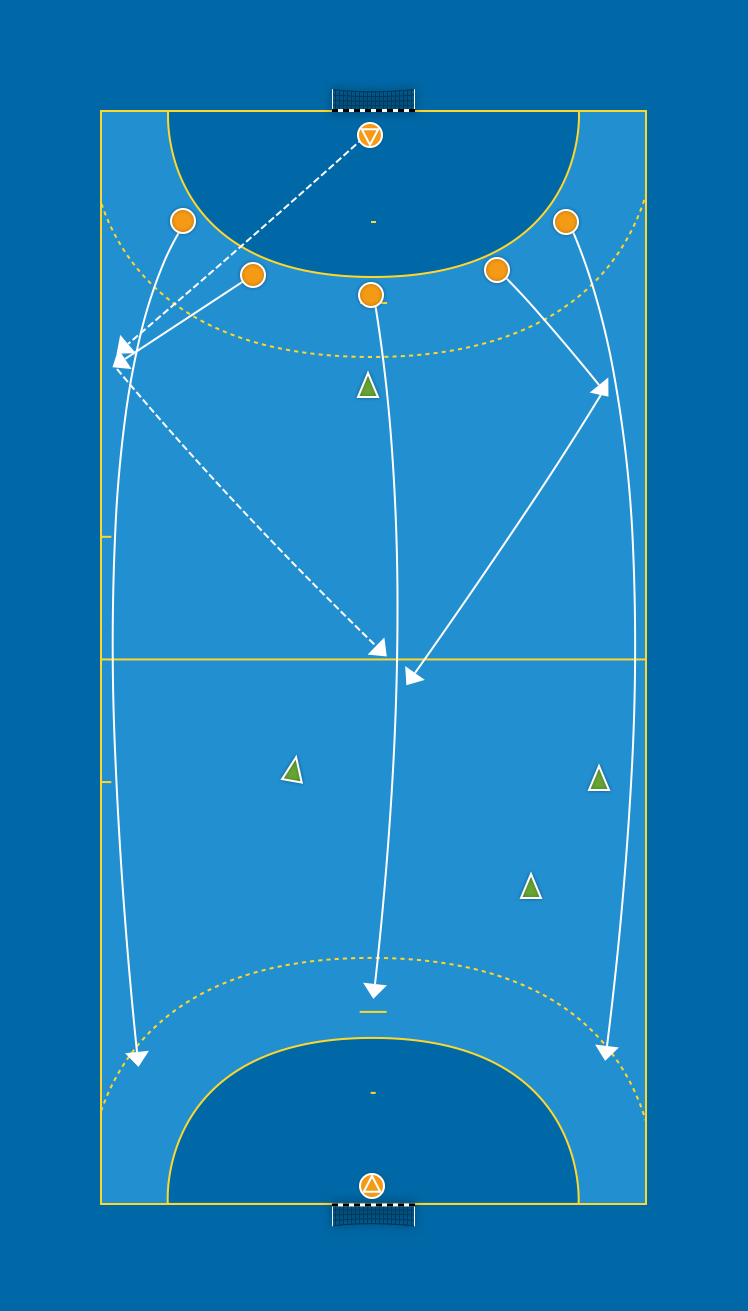 Samma som i övning 7 men med fem anfallare (tre i fas 1, två i fas 2) mot tre försvarare (en på bortre planhalva, två på egen planhalva). Försök med samma speluppbyggnad.
