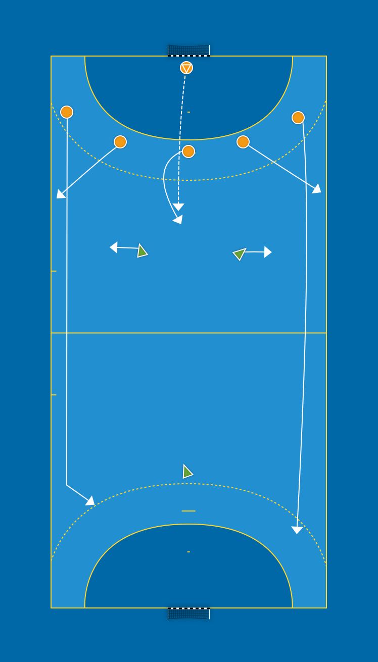 Samma som i övning 8, men med två försvarare på bortre planhalva. En försvarare på egen planhalva, två anfallare i fas 1 och tre anfallare i fas 2. Försök med samma speluppbyggnad.