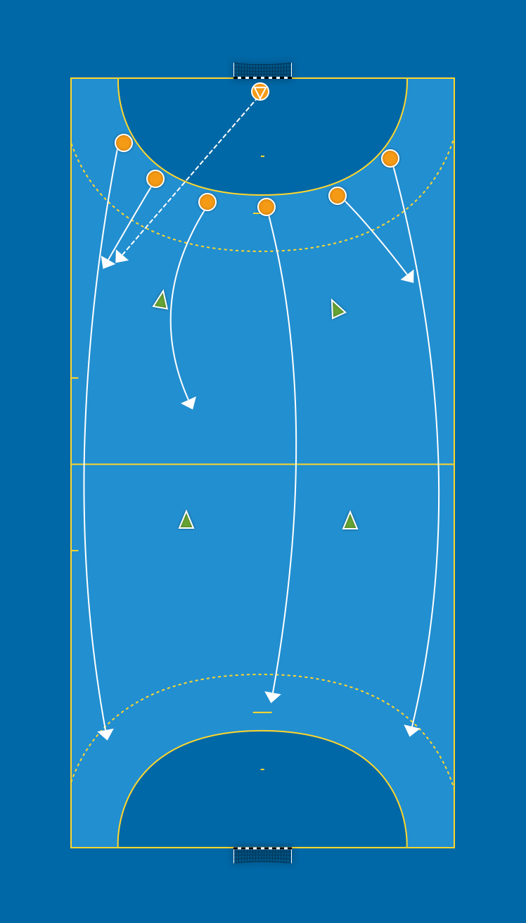 Sex anfallare mot fyra försvarare. Två försvarare på bortre planhalva, två försvarare på egen planhalva. Försök med samma speluppbyggnad samt att målvakten får spela bollen till 3:an i andra vågen som väljer bollvägar. Se till att fas 2 inte kommer på linje i uppspelet.