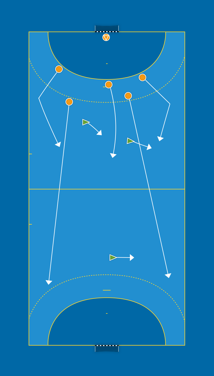 Samma som i övning 4 men med en anfallare till CH som kommer i fas 2, två försvarare på egen planhalva och en försvarare på bortre planhalva. Samma speluppbyggnad. Målvakten ska finna rätt lösning.