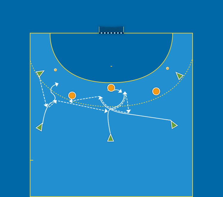 Mittväxlar 3 9m led och 2 K6 med 3 försvarare och 2 koner. V6 spelar V9 som skottsatsar och spelar M9, M9 växlar upp (växelns utförande se Passningar) H9 som skjuter eller spelar vidare till V9, V9 väljer skott eller utspel V6. Alternera vänster och höger.