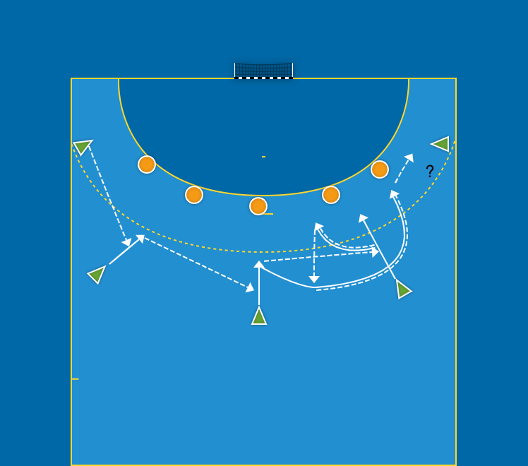 Praktisk tillämpningsövning, 5 anfaller (2 K6 och 3 9M spelare) 5 försvarare. Bollen startar hos ex. V6 som spelar till V9 eller M9. M9