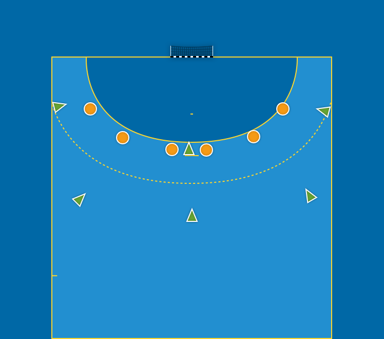 Tillämpningsövning spel på ett eller två mål (6 mot 6) Betona växlingsspel mellan 9m spelarna och K6, d.v.s. övningar 1-7. Prova integrering av K6 spelet efter en stund.