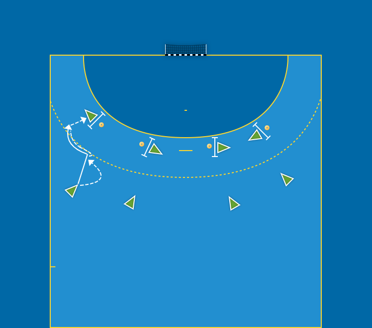 M6 lär sig att dela av försvaret. En 9m spelare och en M6 och en kona. 9m kastar upp bollen till sig själv, M6 ställer sig på ena sidan med ryggen mot konen den ena foten så nära 6 m linjen som möjligt. M6 tar bred men korrekt ställning med relativt låg tyngdpunkt, armarna klara för mottagning av inspel med en eller två händer. 9m spelaren går åt det hållet som M6 delar av, 9m spelar in M6 avslutar på mål, pröva;