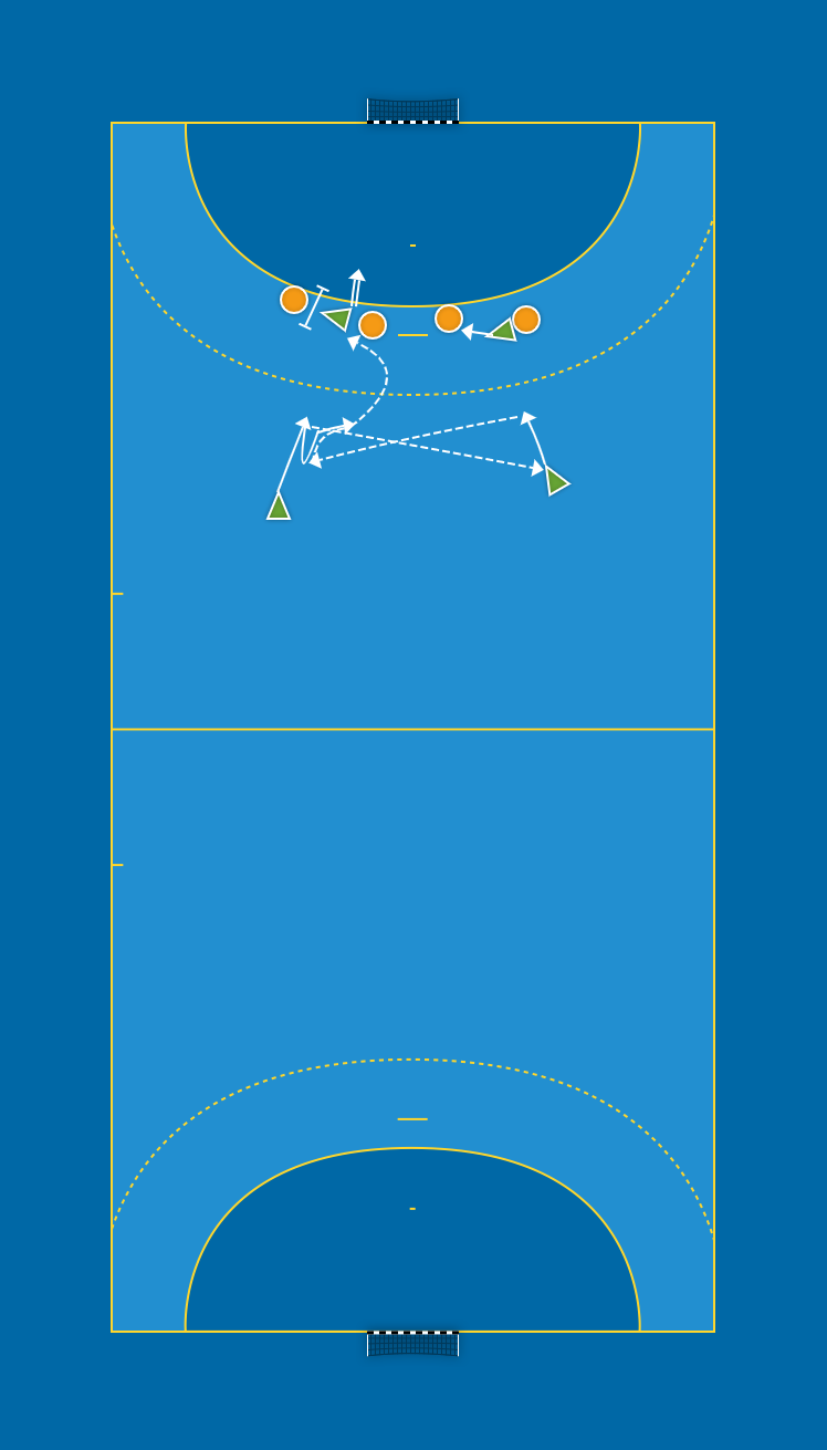 Samma som övning 3 men med 4 försvarare. 9m spelarna kan vända/spela bollen mellan varandra M6:orna delar och väntar på inspel.