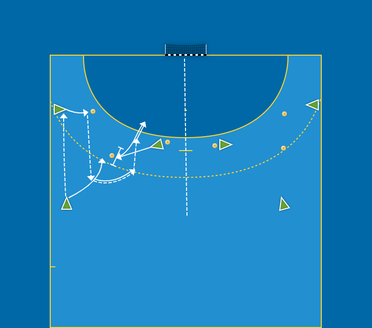Rysk spärr på offensiv 2:a inåt. 9m spelare K6, som attackerar lätt och spelar tillbaka till 9m spelaren. 9m spelaren skottsatsar eller gör en steg- isätning mot 2:an (kon), samtidigt går M6 upp på insidan av 2:an och slår en "ryggspärr" (kon). 9m spelaren spelar in bollen (studsinspel) eller skjuter.